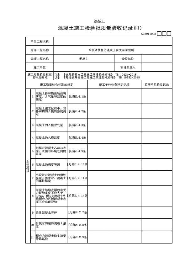 表格名称:G03011002 【混凝土】混凝土施工检验批质量验收记录(Ⅲ)