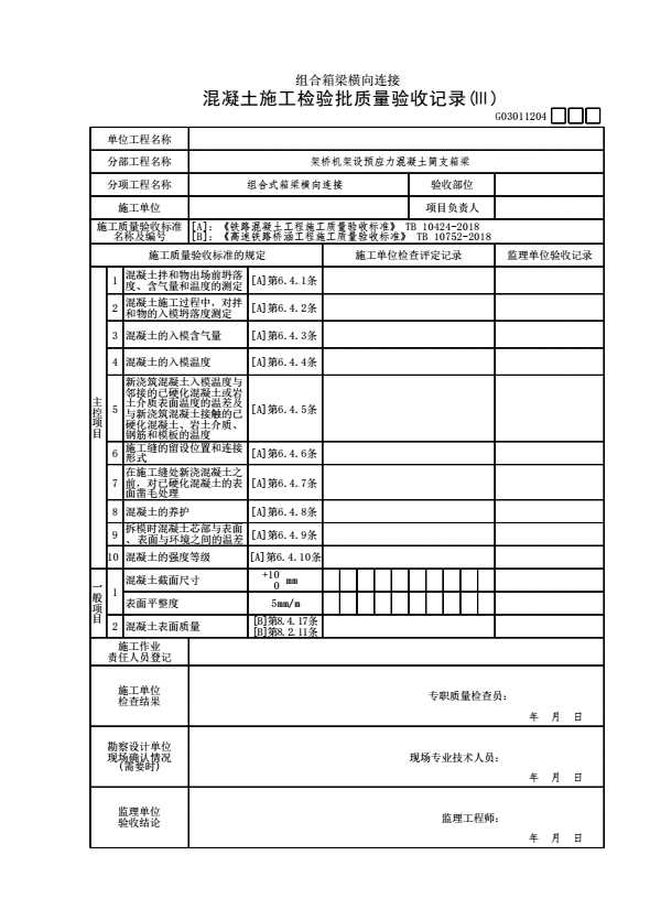 表格名称:G03011204 【组合式箱梁横向连接】混凝土施工检验批质量验收记录(Ⅲ)