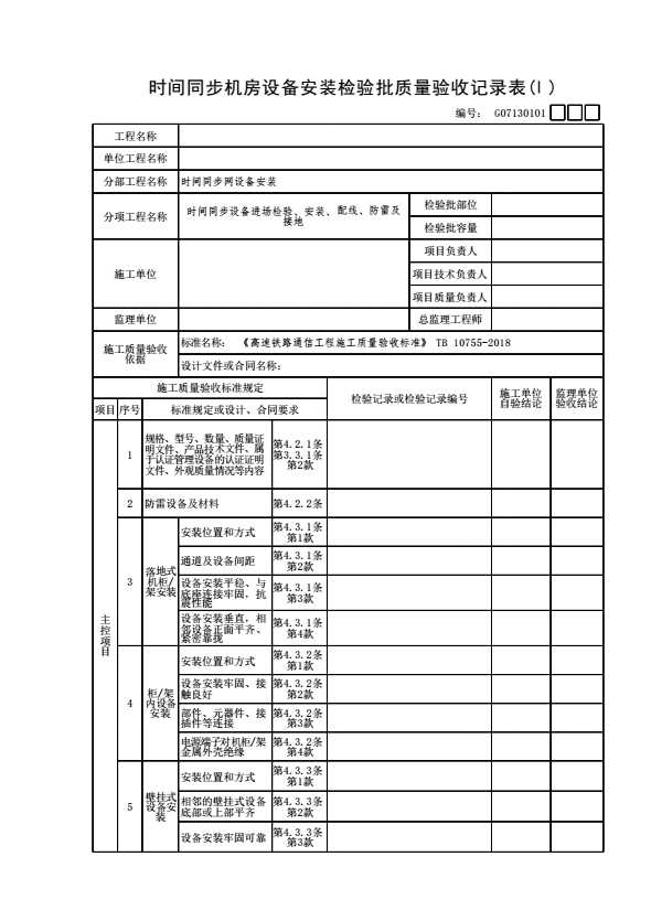 表格名称:G07130101 时间同步机房设备安装检验批质量验收记录表(Ⅰ)