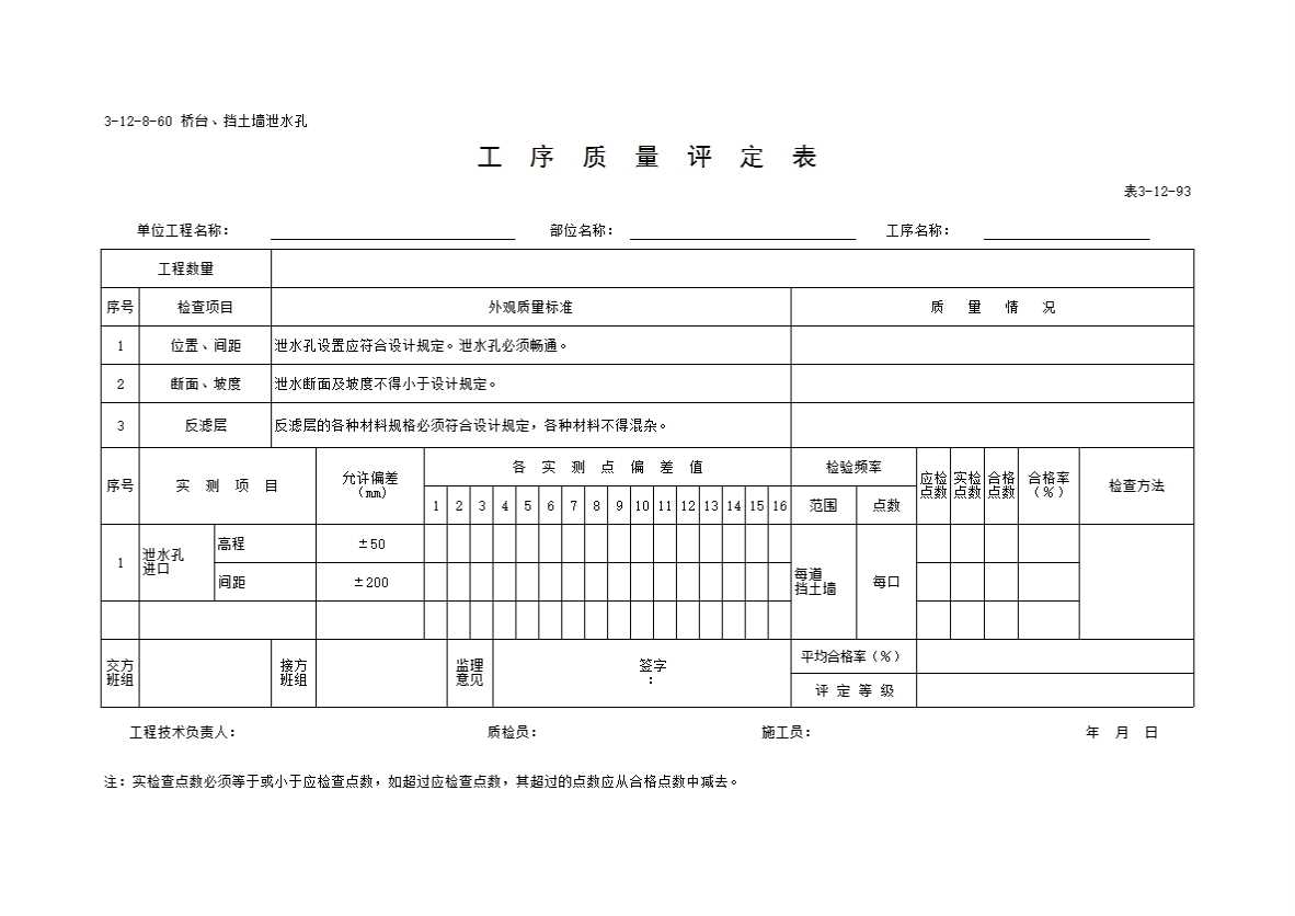 表格名称:工序质量评定表(桥台、挡土墙泄水孔)