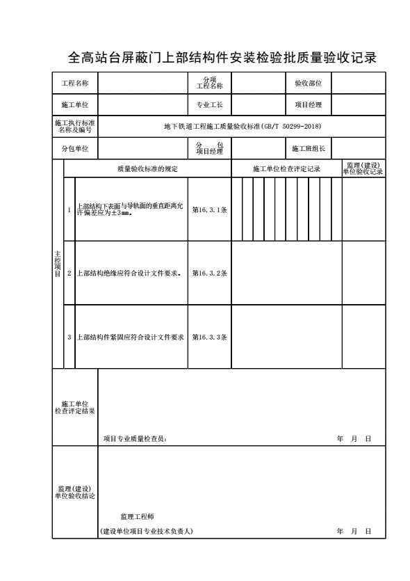 表格名称:全高站台屏蔽门上部结构件安装检验批质量验收记录