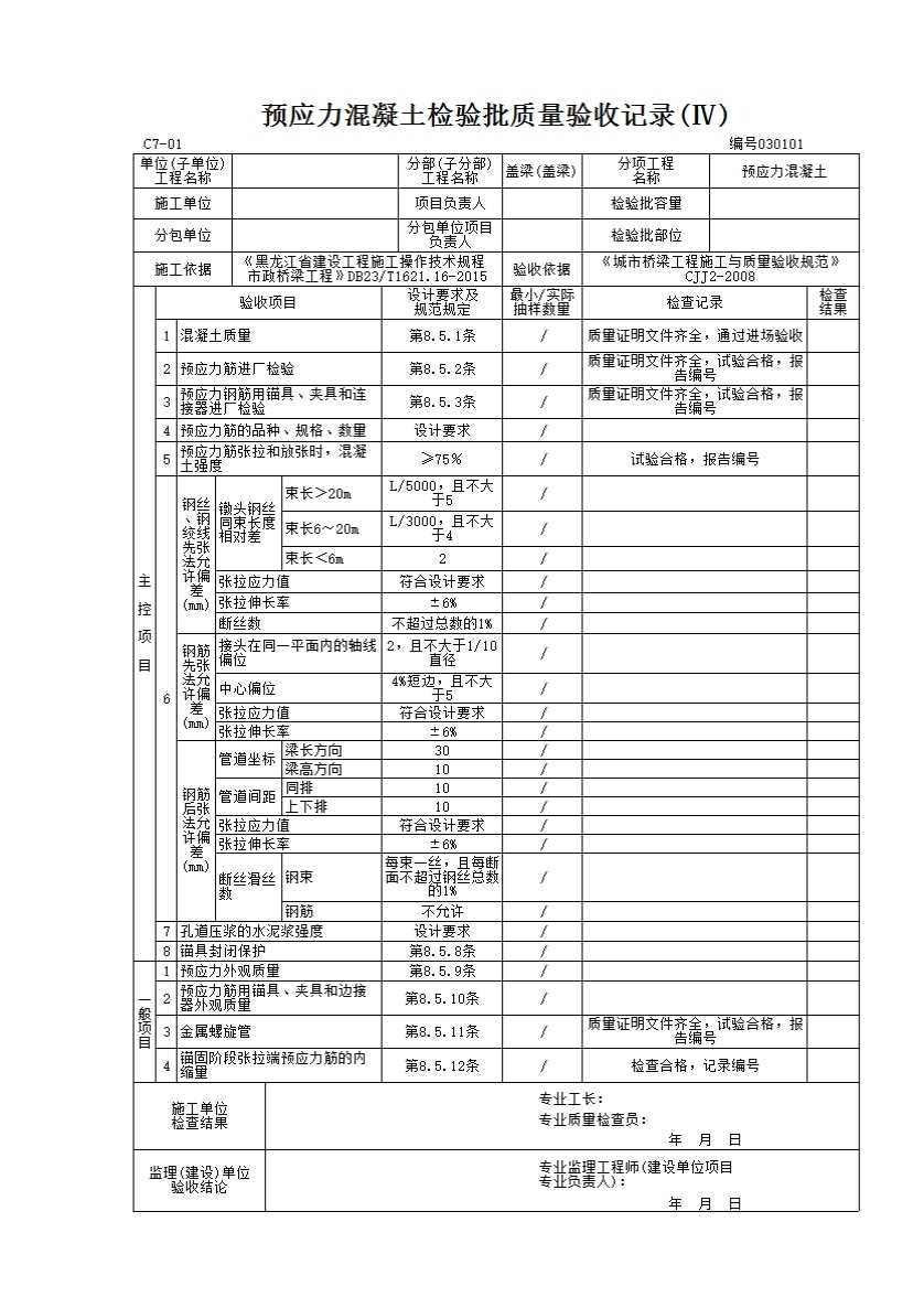 表格名称:030101 预应力混凝土检验批质量验收记录(Ⅳ)