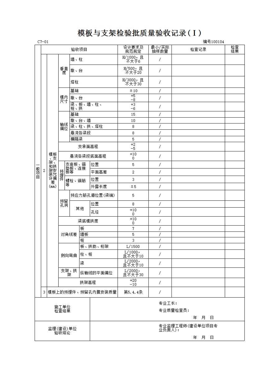 表格名称:100104 模板与支架检验批质量验收记录(Ⅰ)