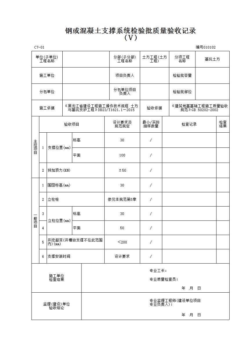 表格名称:010102 钢或混凝土支撑系统检验批质量验收记录(Ⅴ)