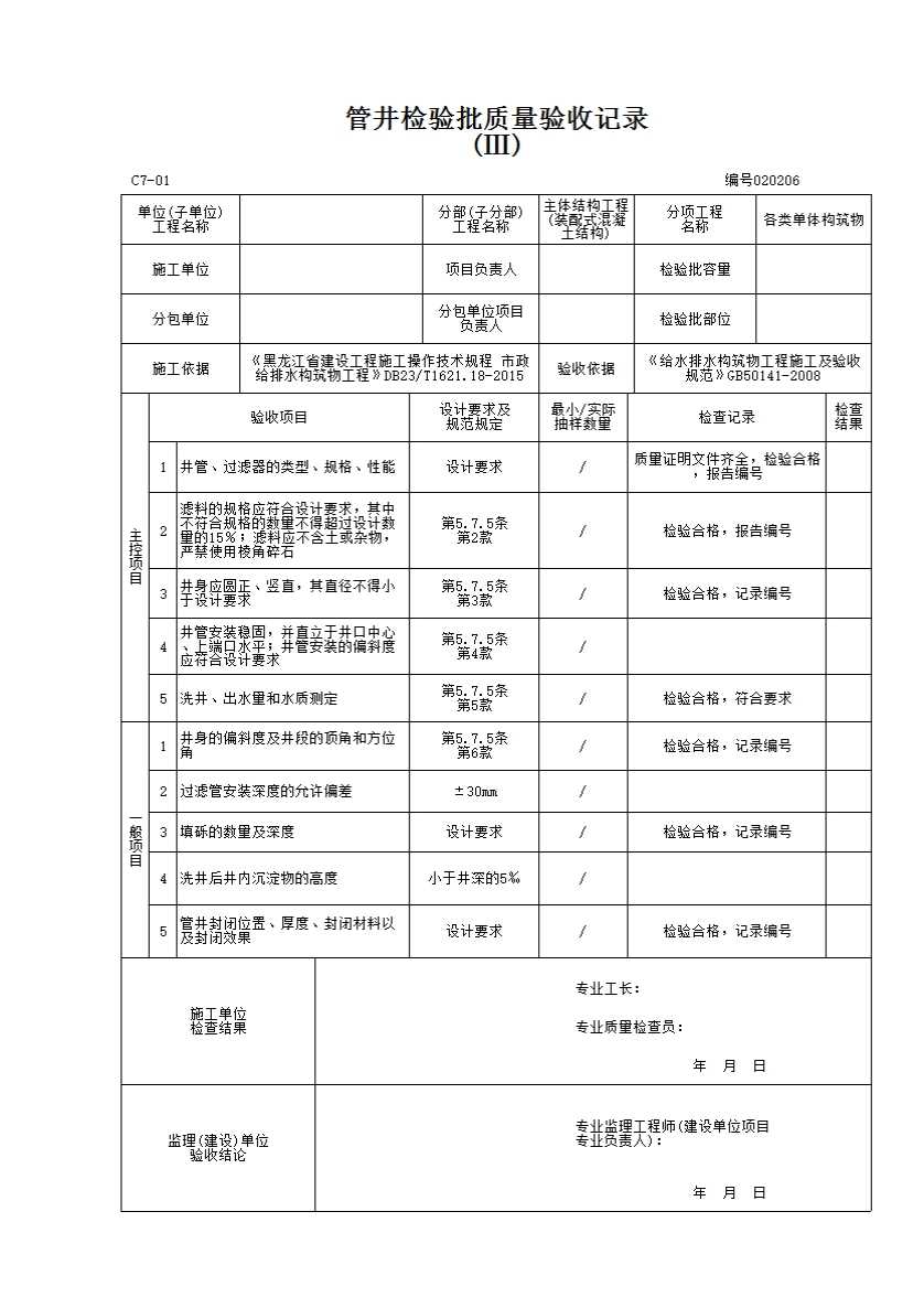 表格名称:020206 管井检验批质量验收记录(Ⅲ)