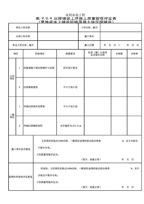 表格名称:表 9.0.4 沉排铺设工序施工质量验收评定表