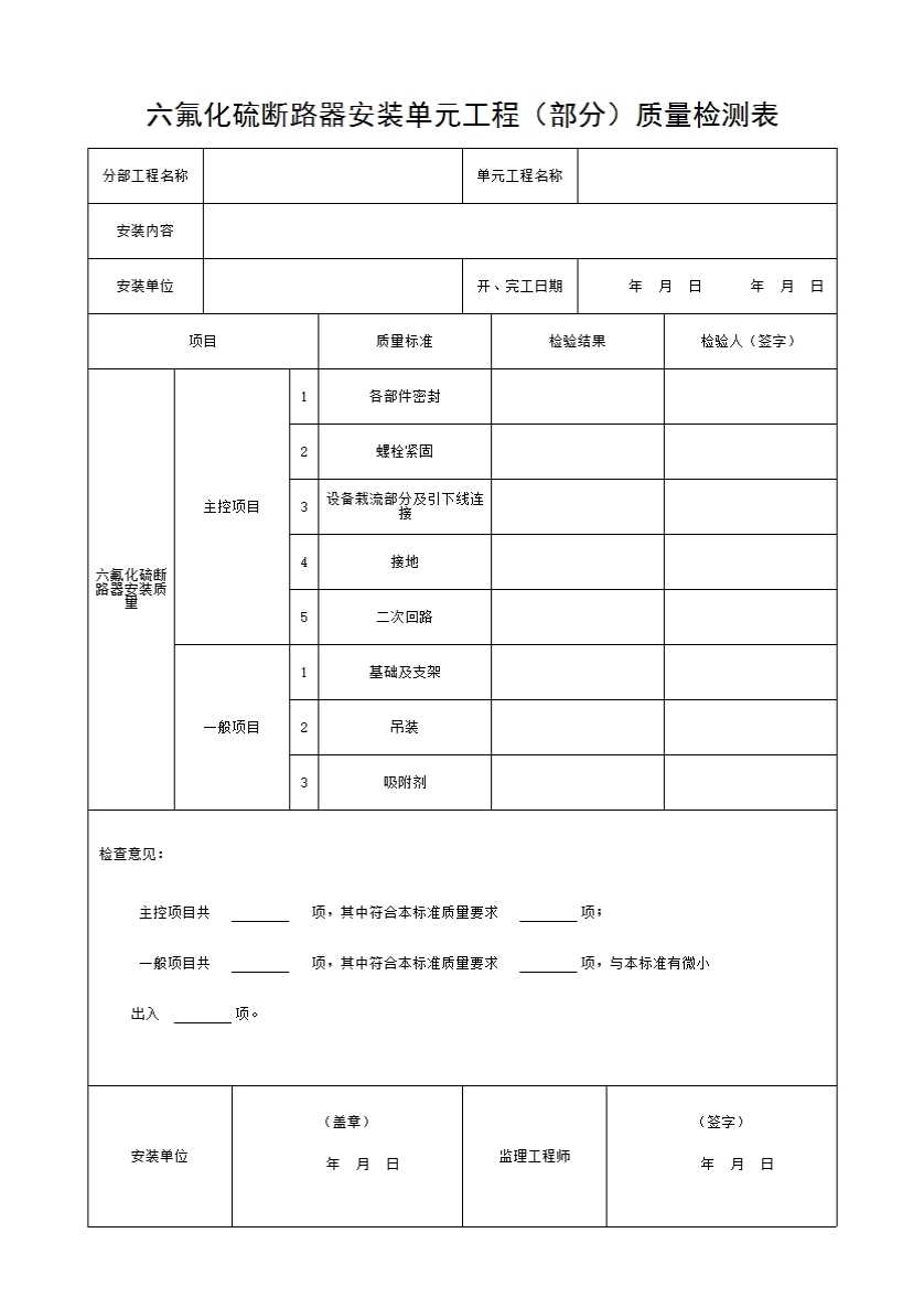 六氟化硫断路器安装单元工程(部分)质量检测表2