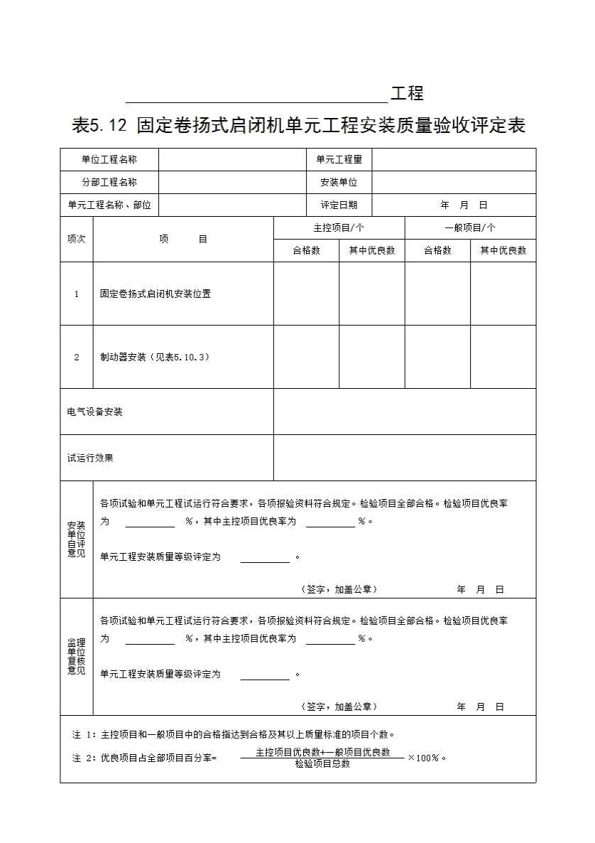 表5.12 固定卷扬式启闭机单元工程安装质量验收评定表
