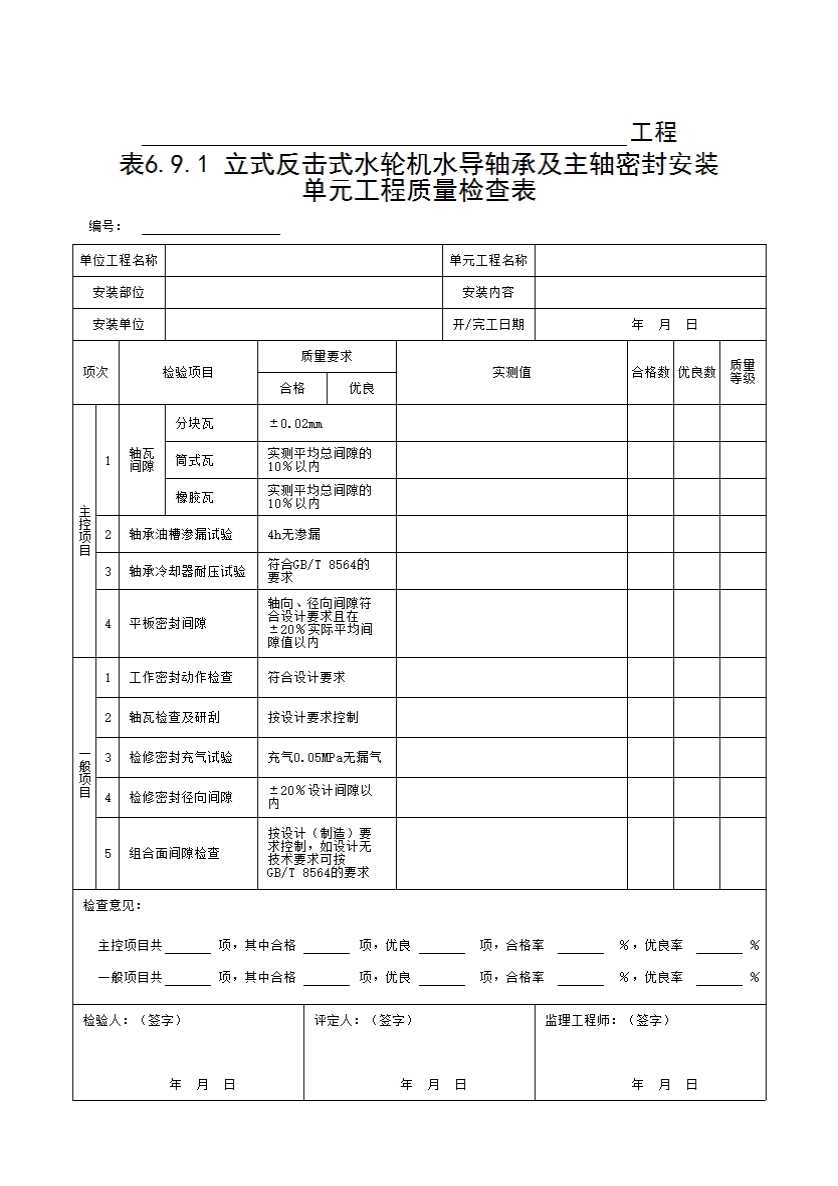 表格名称:表6.9.1 立式反击式水轮机水导轴承及主轴密封安装单元工程质量检查表