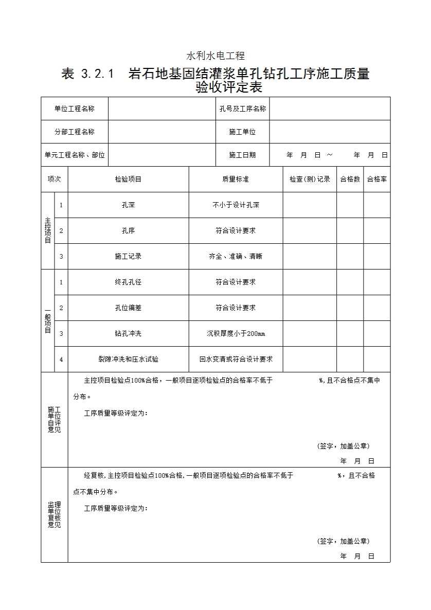表 3.2.1 岩石地基帷幕灌浆单孔灌浆工序施工质量验收评定表