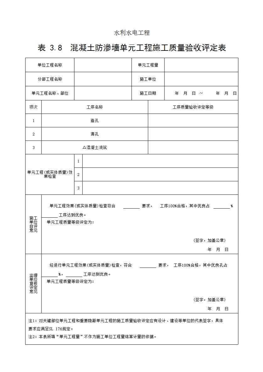 表3.8 混凝土防渗墙单元工程施工质量验收评定表