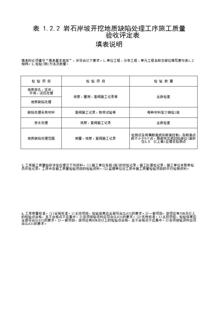表1.2.2 岩石岸坡开挖地质缺陷处理工序施工质量验收评定表