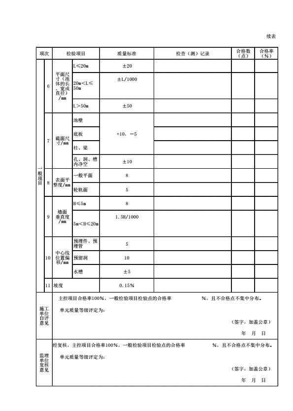 表6.1 混凝土结构水池单元工程施工质量验收评定表