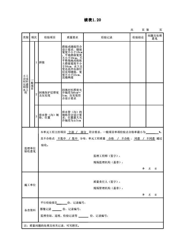 表格名称:表1.20 土工合成材料反滤和排水工程单元工程施工质量验收表
