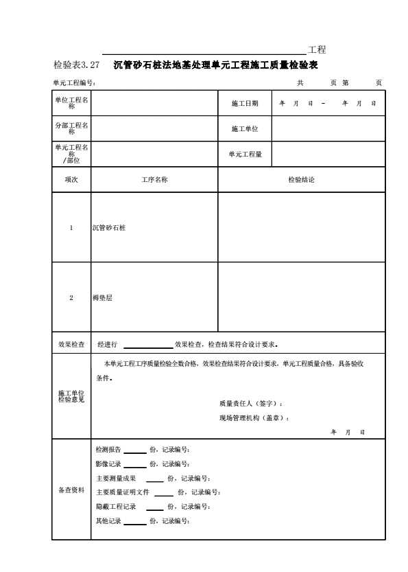 表格名称:表3.27 沉管砂石桩法地基处理单元工程施工质量检验表
