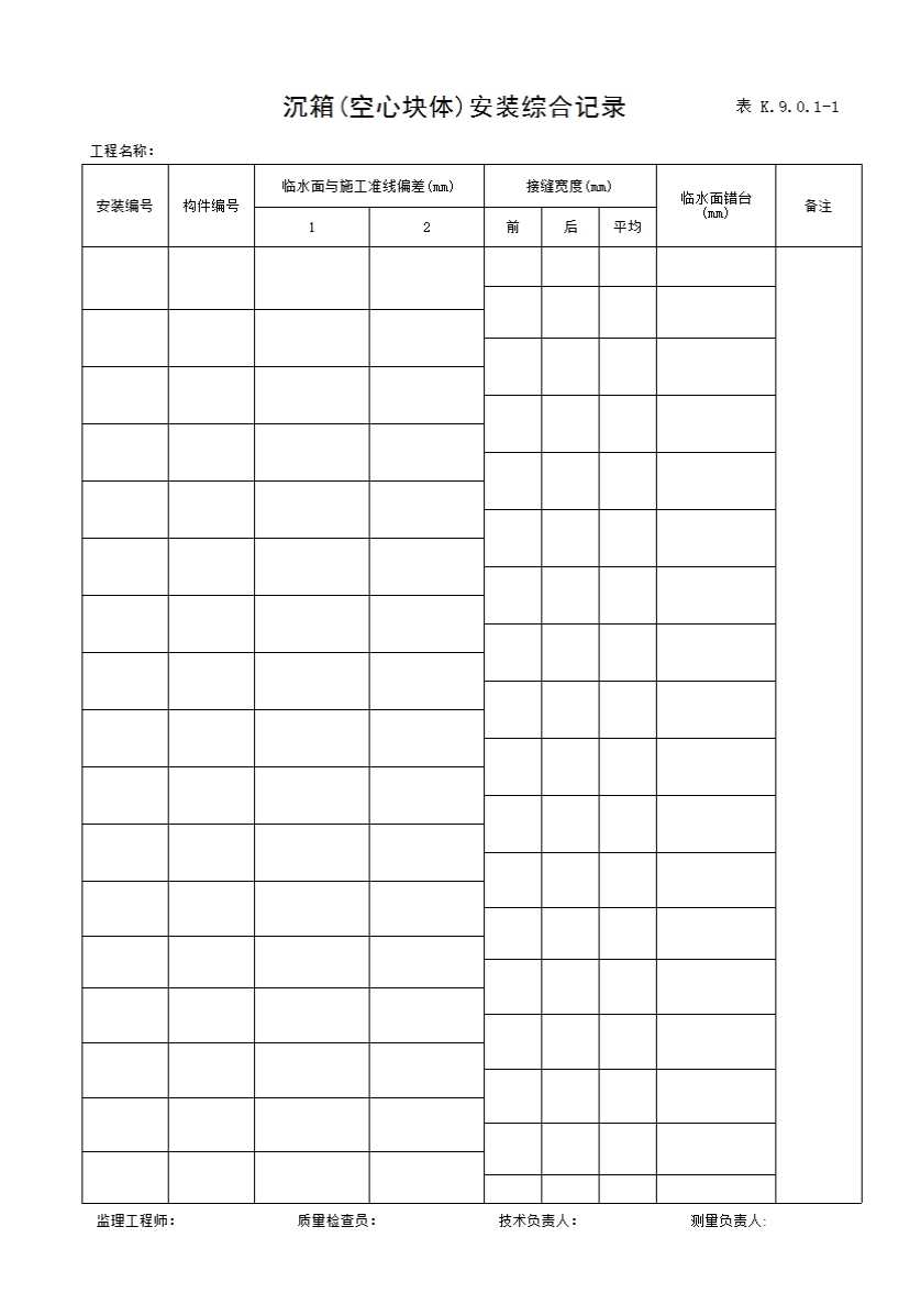 表格名称:表K.9.0.1-1 沉箱(空心块体)安装综合记录