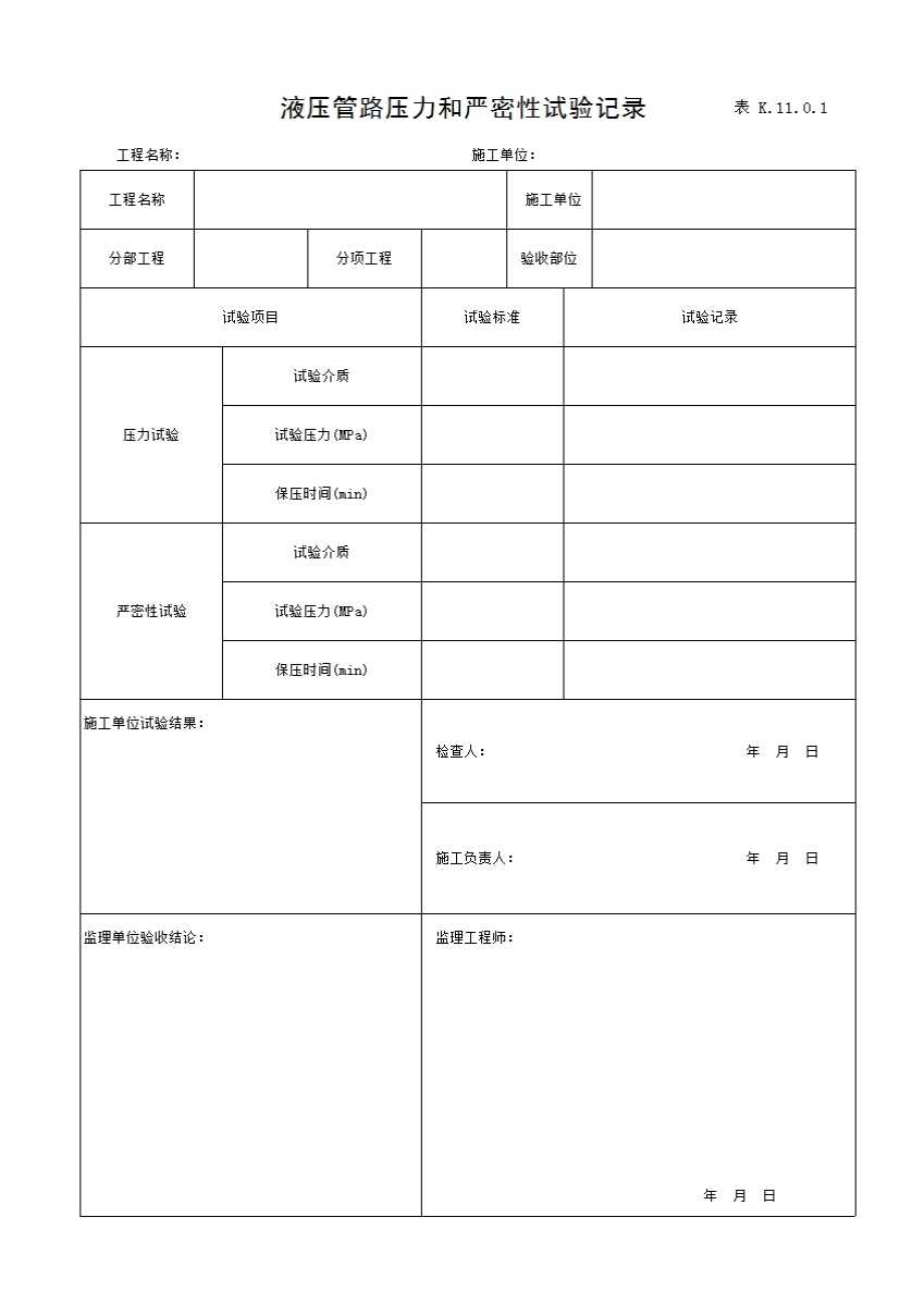表格名称:表K.11.0.1 液压管路压力和严密性试验记录