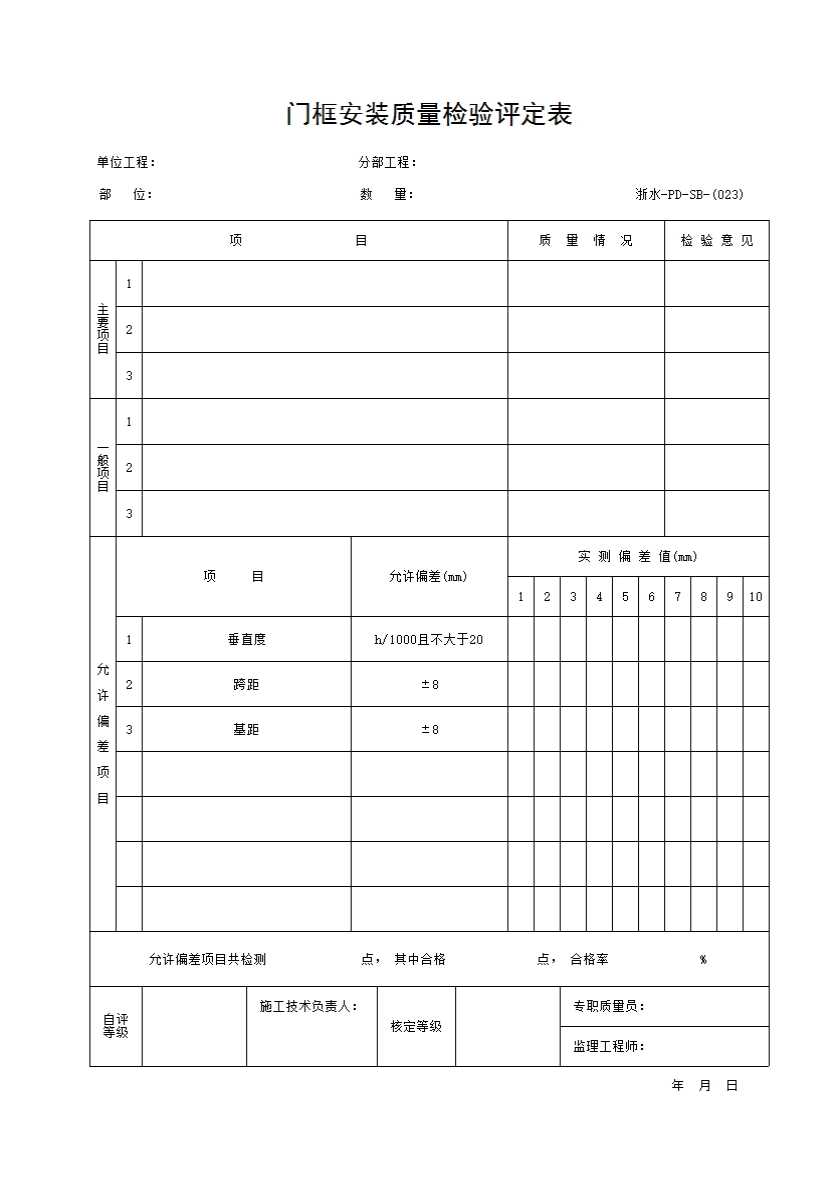 表格名称:023 门框安装质量检验评定表