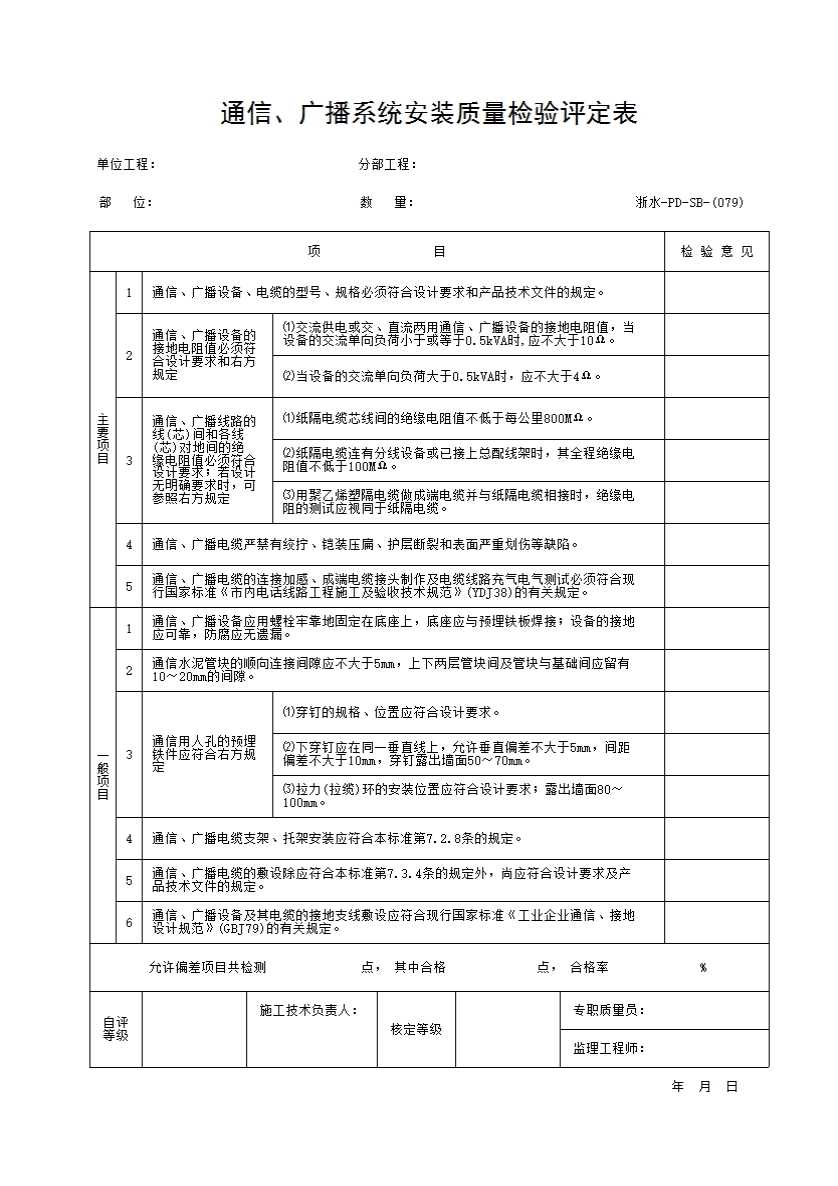 表格名称:079 通信、广播系统安装质量检验评定表