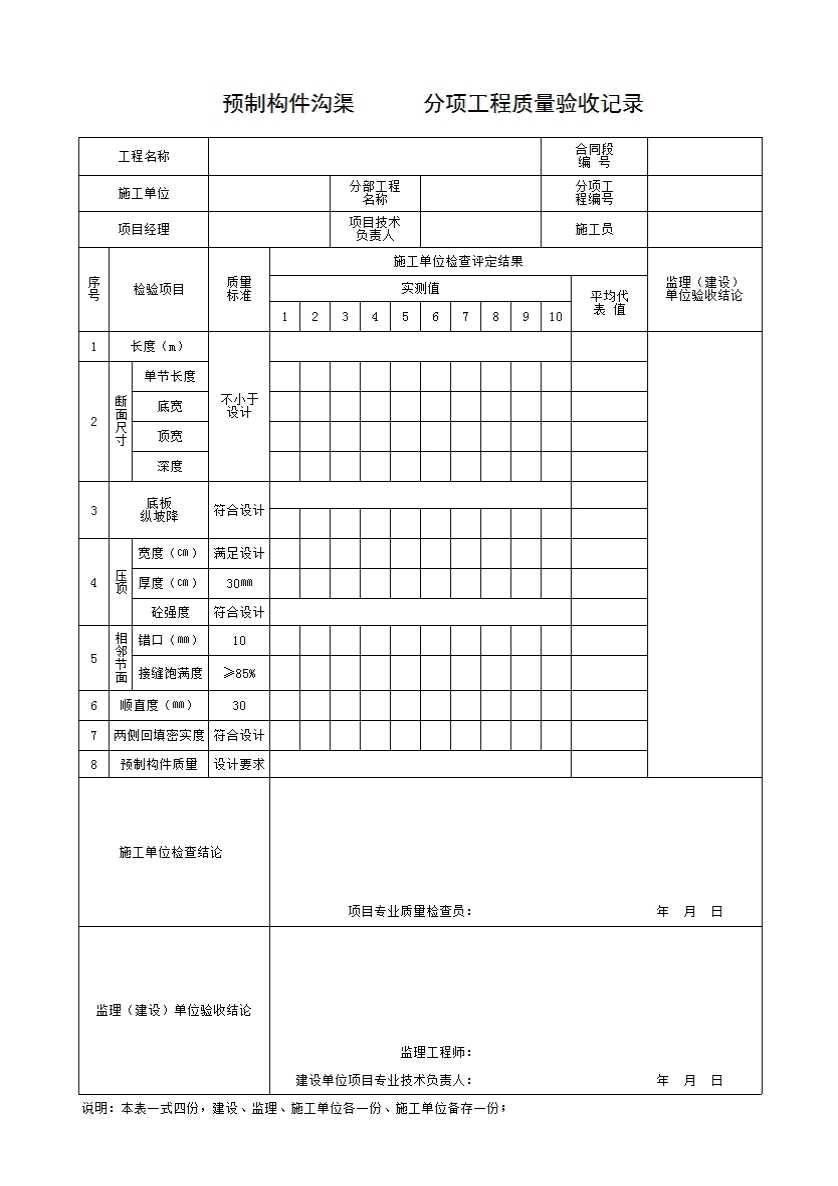 表格名称:预制构件沟渠分项工程质量检验评定表08
