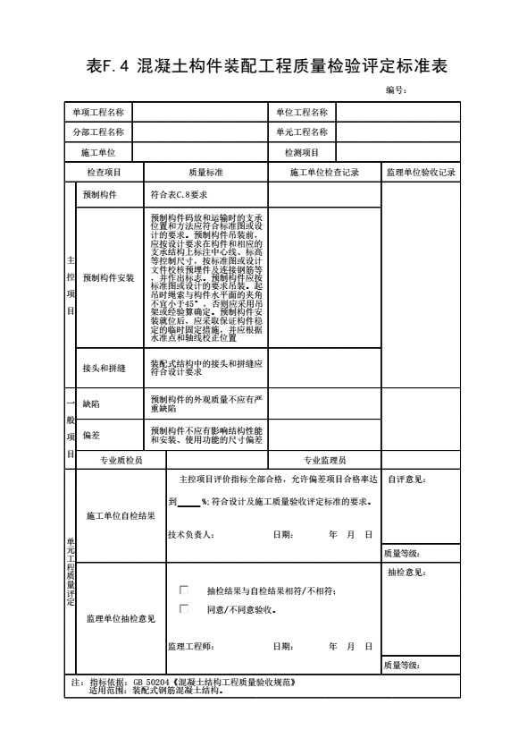 表格名称:表F.4 混凝土构件装配工程质量检验评定标准表