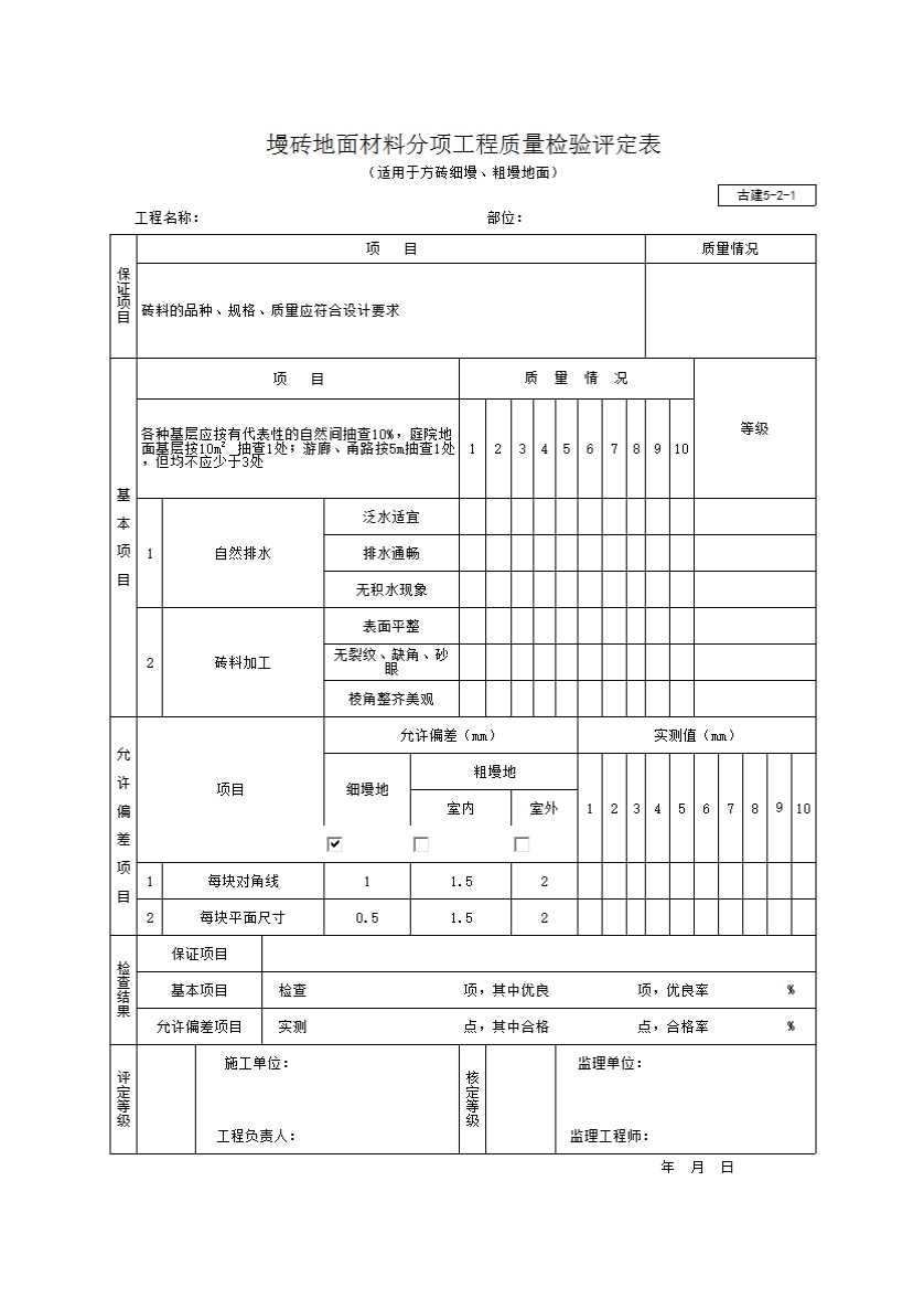表格名称:墁砖地面材料分项工程质量检验评定表