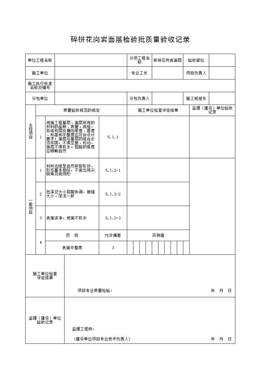 表格名称:碎拼花岗岩面层检验批质量验收记录