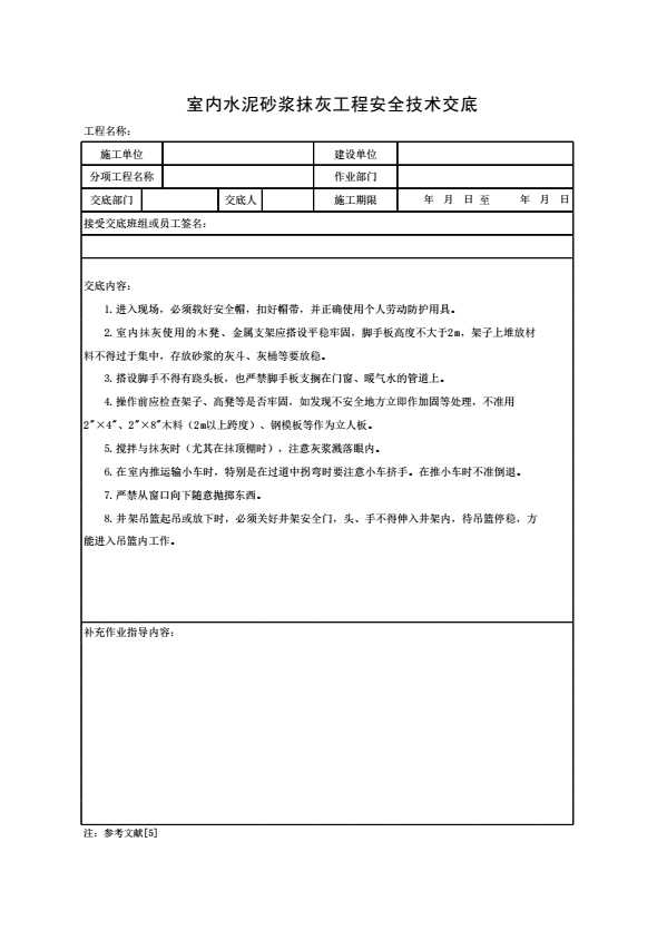 表格名称:室内水泥砂浆抹灰工程安全技术交底