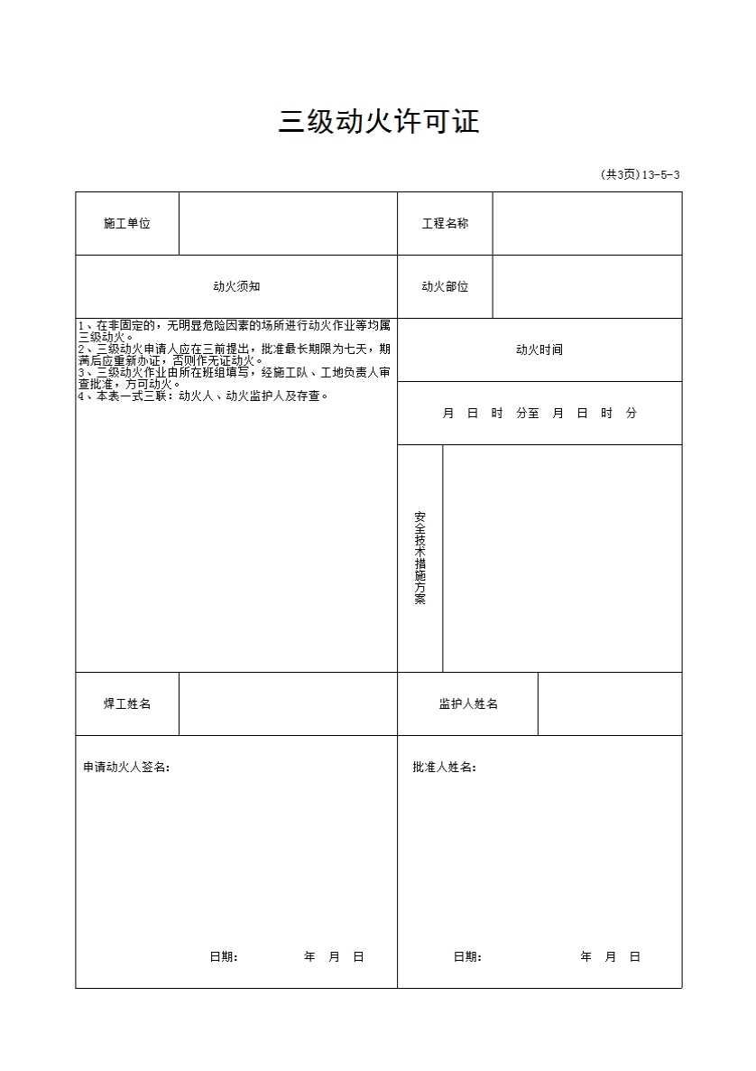 表格名称:0130503_三级动火许可证_13-5-3