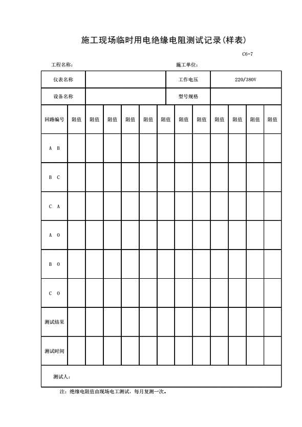 表格名称:C6-7 施工现场临时用电绝缘电阻测试记录(样表)
