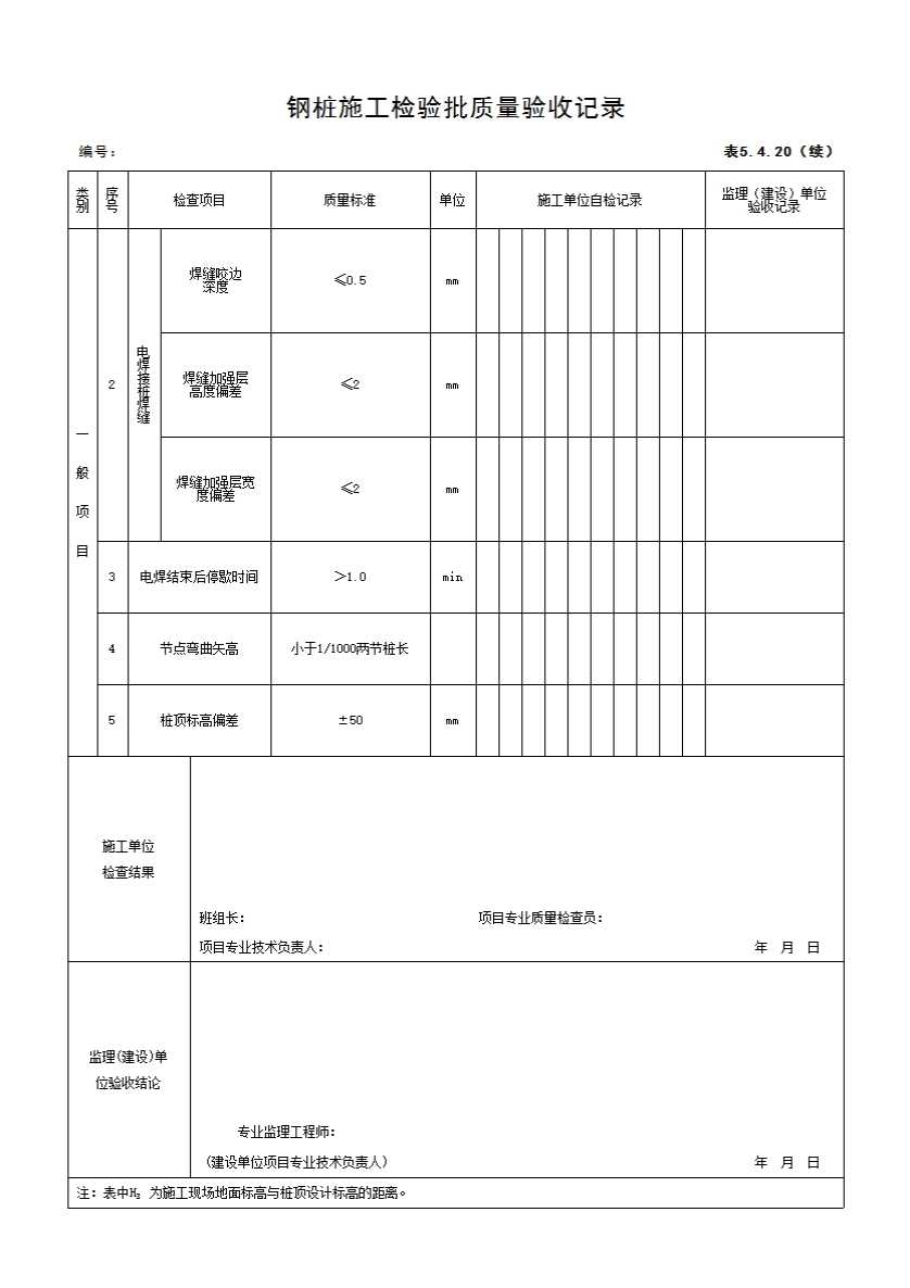 表格名称:5.4.20 钢桩施工检验批质量验收记录