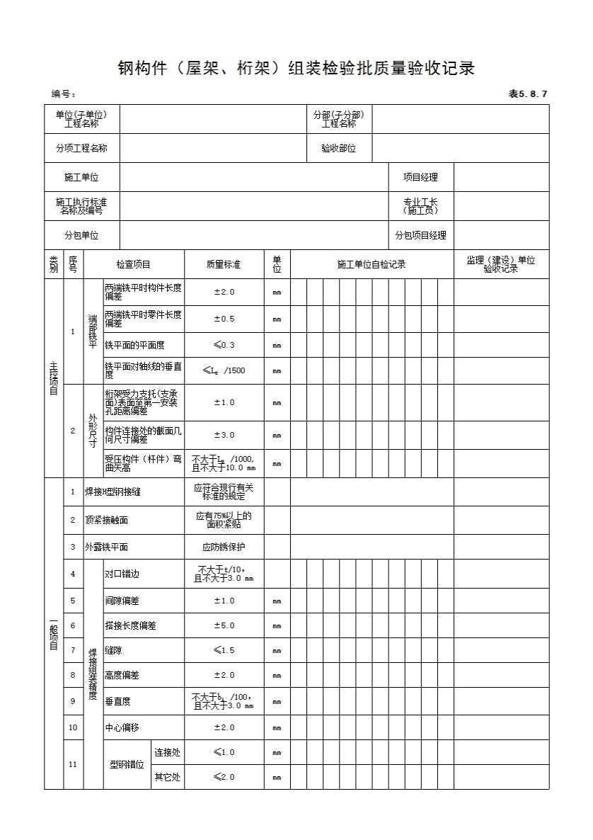 表格名称:5.8.7 钢构件(屋架、桁架)组装检验批质量验收记录