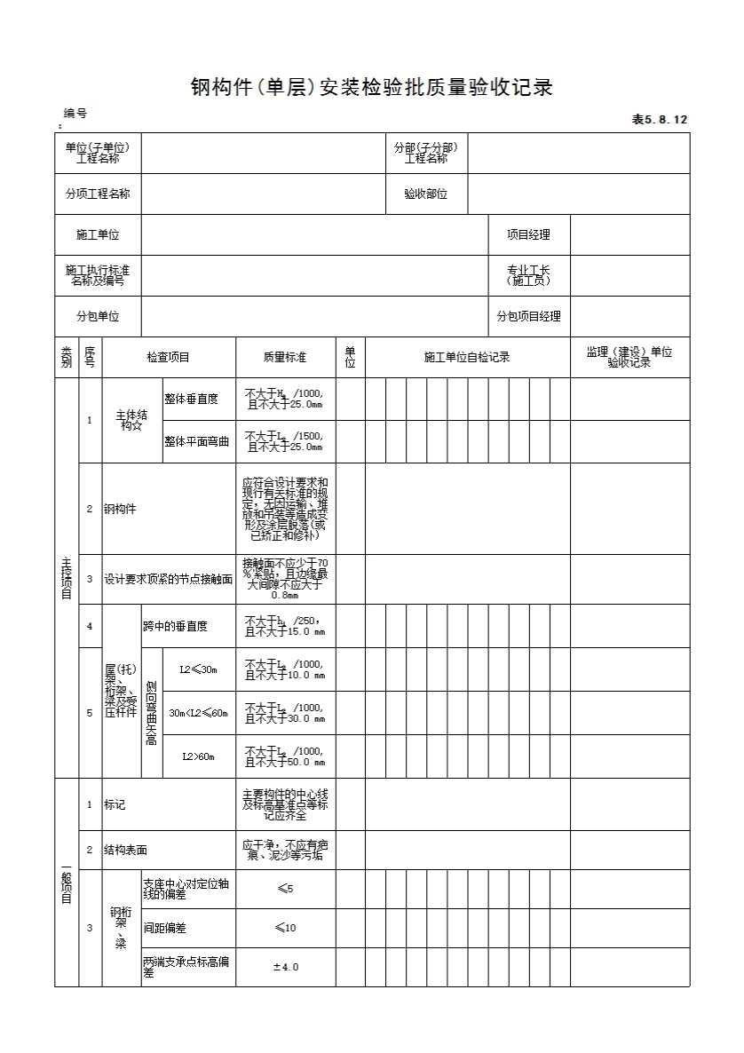 表格名称:5.8.12 钢构件(单层)安装检验批质量验收记录