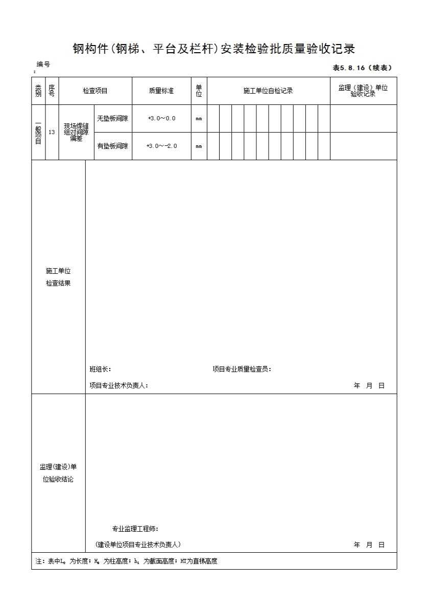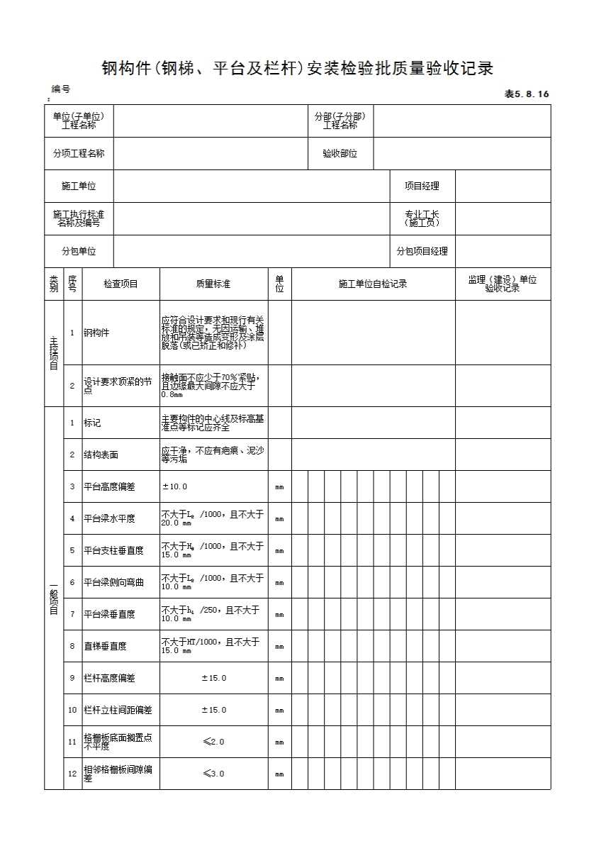 表格名称:5.8.16 钢构件(钢梯、平台及栏杆)安装检验批质量验收记录