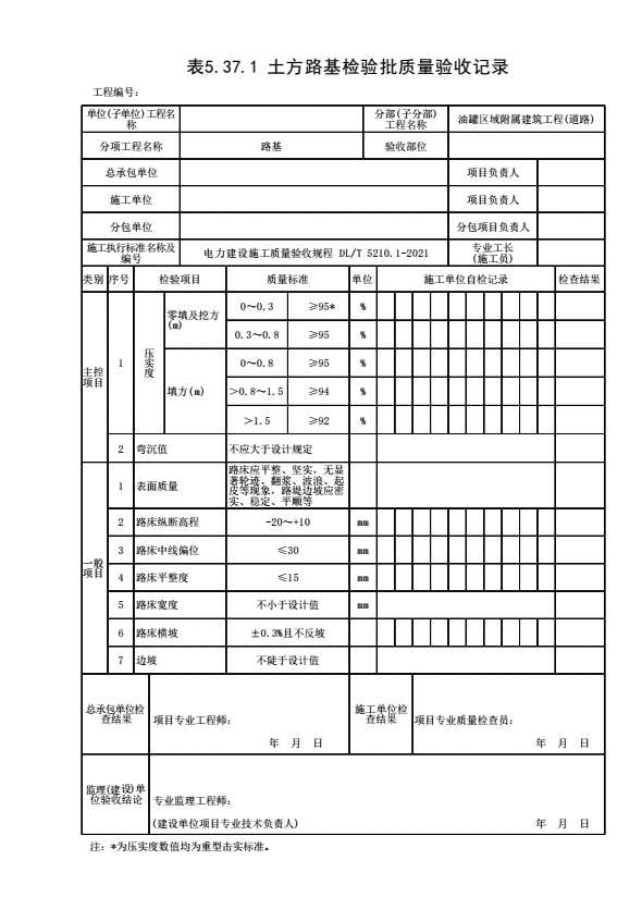 表格名称:表5.37.1 土方路基检验批质量验收记录