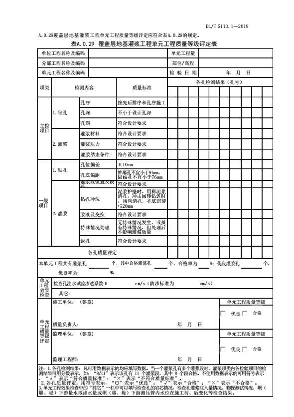 表A.0.29 覆盖层地基灌浆工程单元工程质量等级评定表