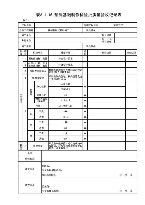 表格名称:表6.1.15 预制基础制作检验批质量验收记录表