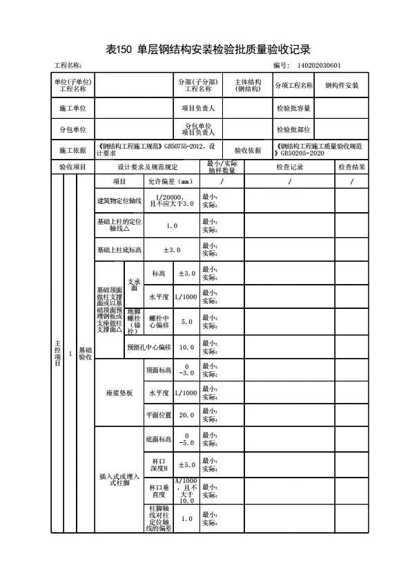 表格名称:140202030601 单层钢结构安装检验批质量验收记录