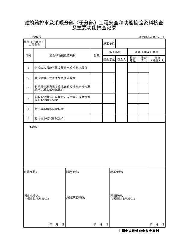 表格名称:电土验表3.0.13-14 建筑给排水及采暖分部(子分部)工程安全和功能检验资料核查及主要功能抽查记录