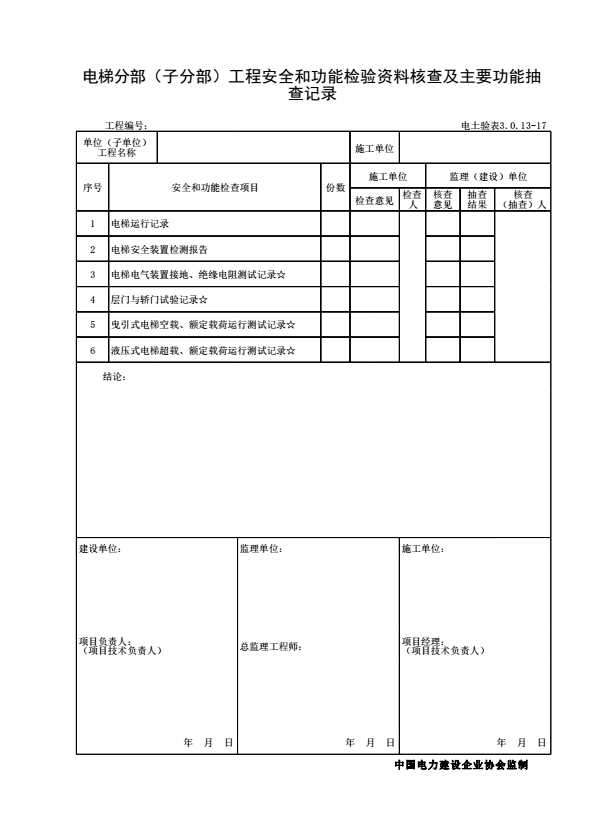 表格名称:电土验表3.0.13-17 电梯分部(子分部)工程安全和功能检验资料核查及主要功能抽查记录