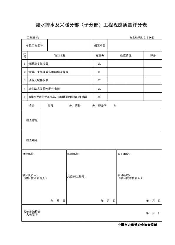 表格名称:电土验表3.0.13-23 给水排水及采暖分部(子分部)工程观感质量评分表