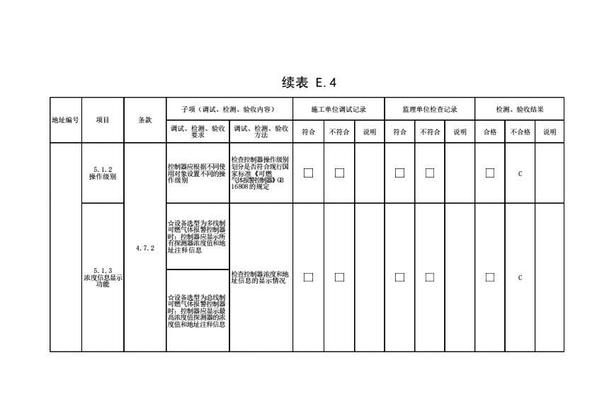 表格名称:表E.4 可燃气体探测报警系统调试、检测、验收记录(续表6)