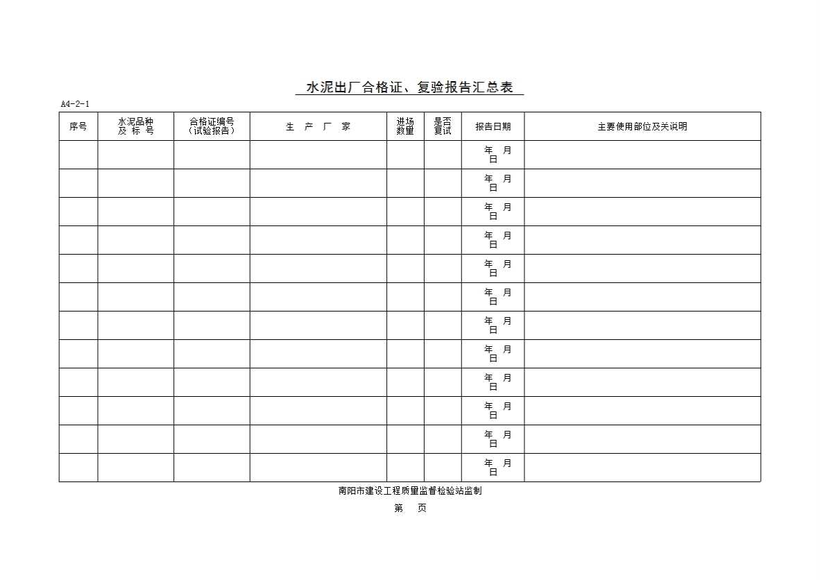 表格名称:A4-2-1 水泥出厂合格证、复验报告汇总表