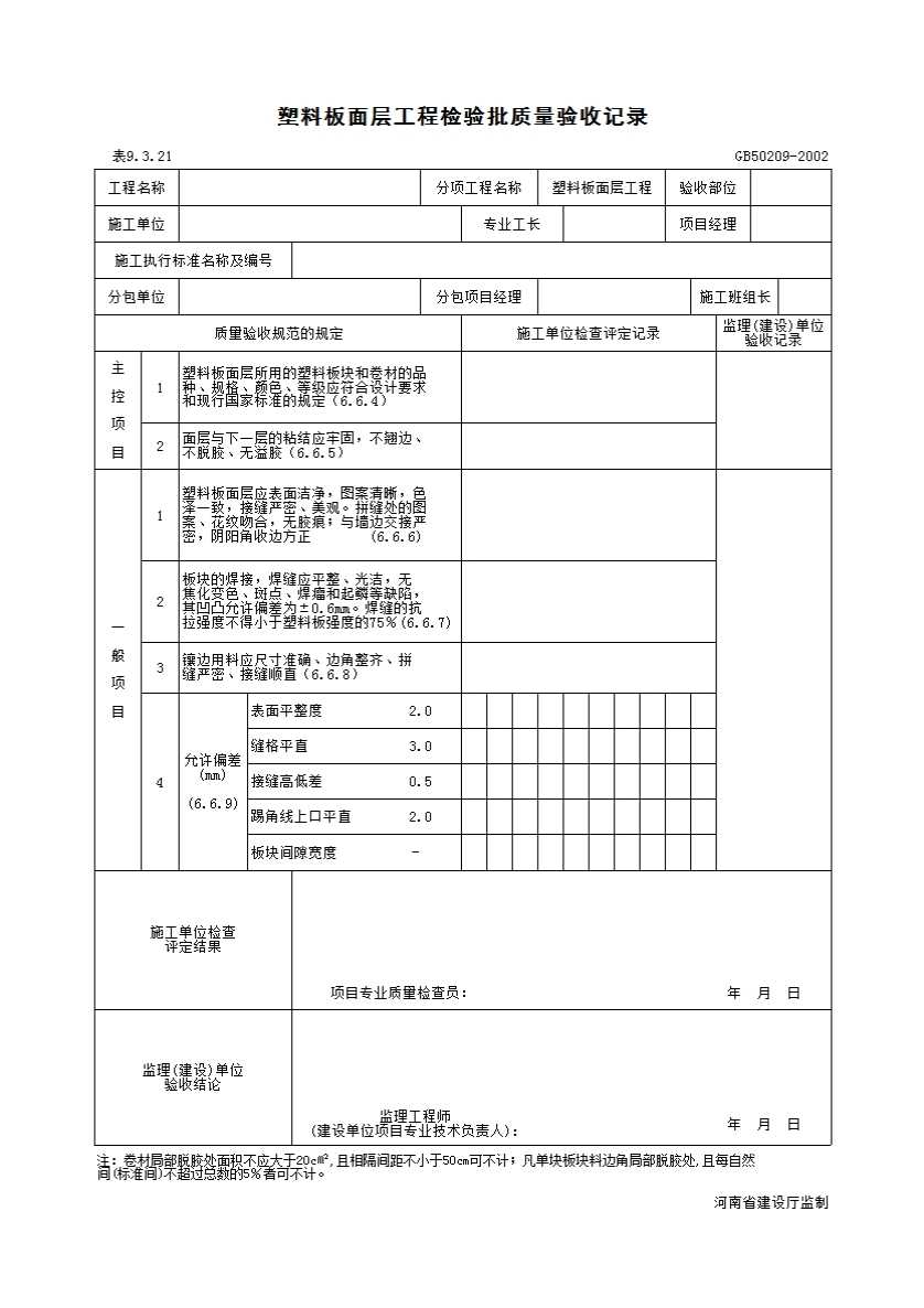 表格名称:9-3-21_塑料板面层工程检验批质量验收记录