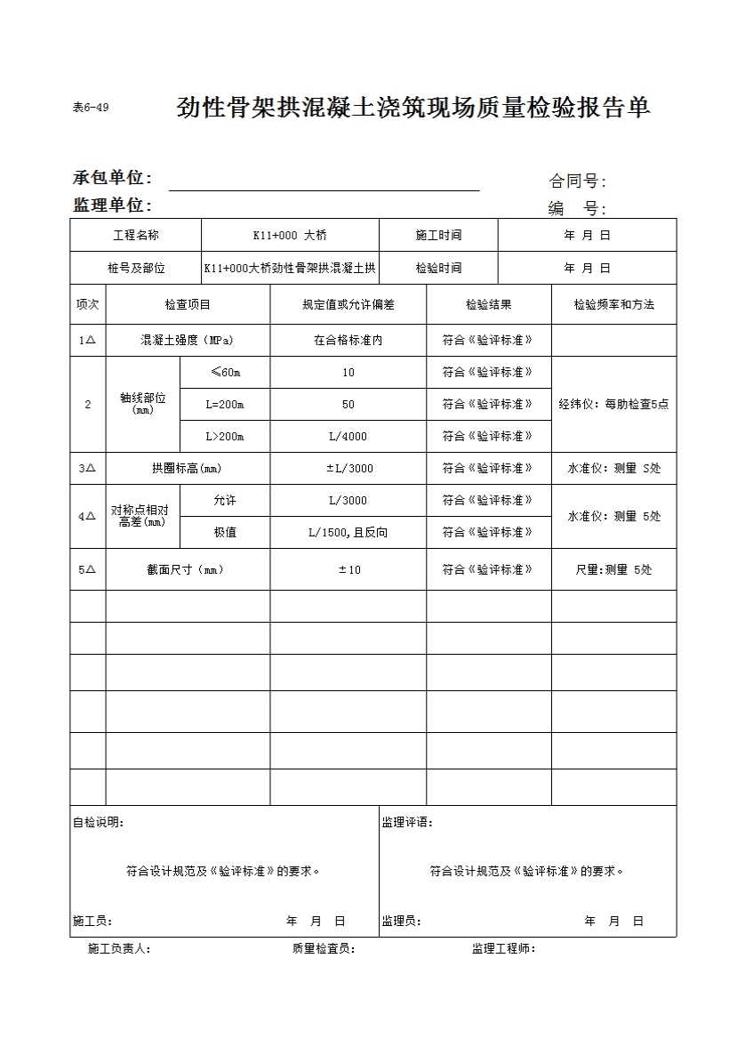 表格名称:表6-49 劲性骨架拱混凝土浇筑现场质量检验报告单