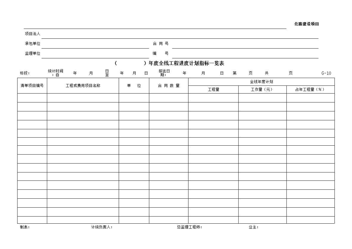 表格名称:G-10 ( )年度全线工程进度计划指标一览表