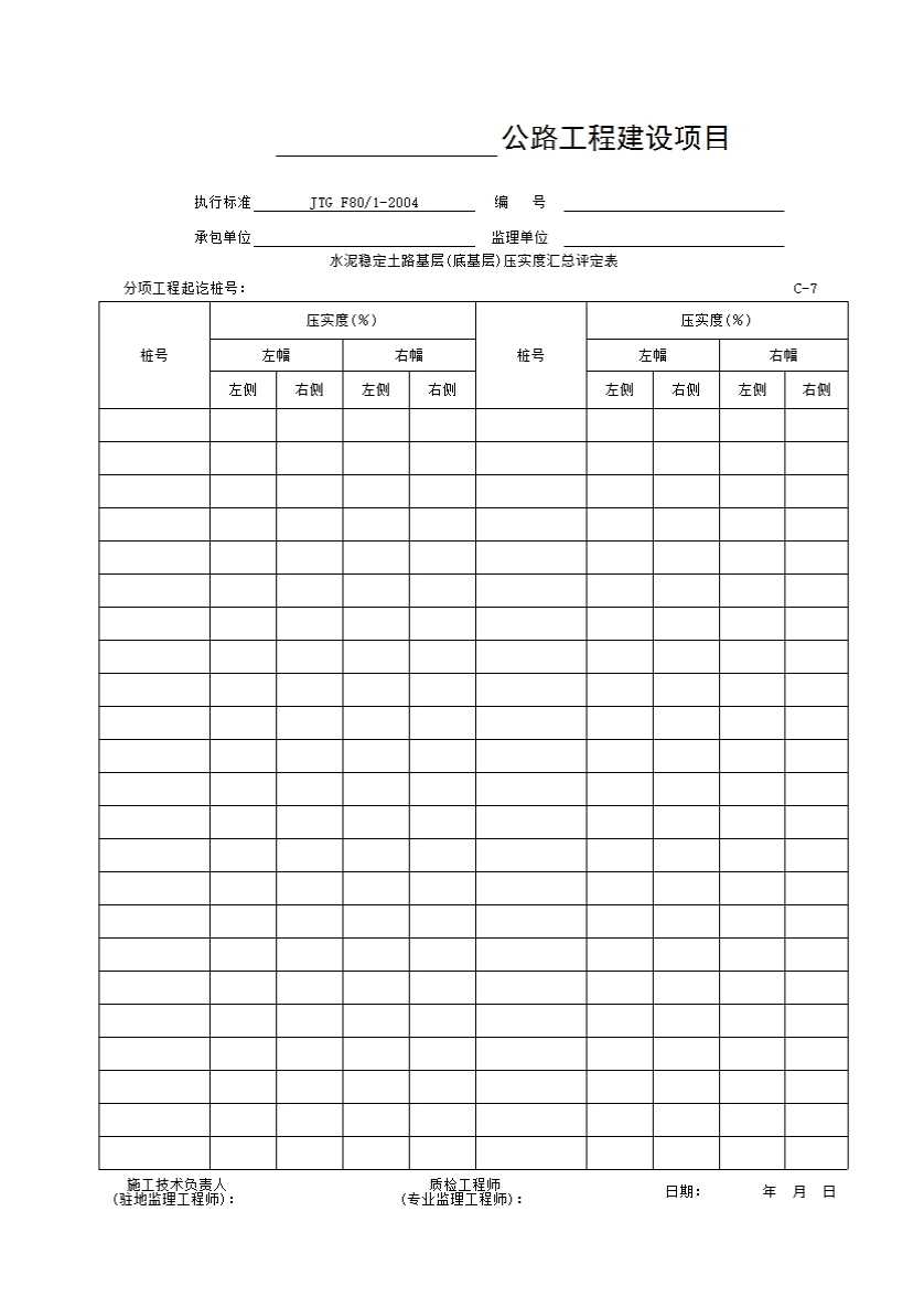 表格名称:C-7表 水泥稳定土路基层(底基层)压实度汇总评定表