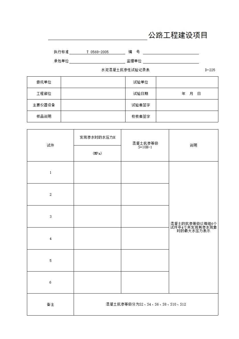 表格名称:D-225 水泥混凝土抗渗性试验记录表