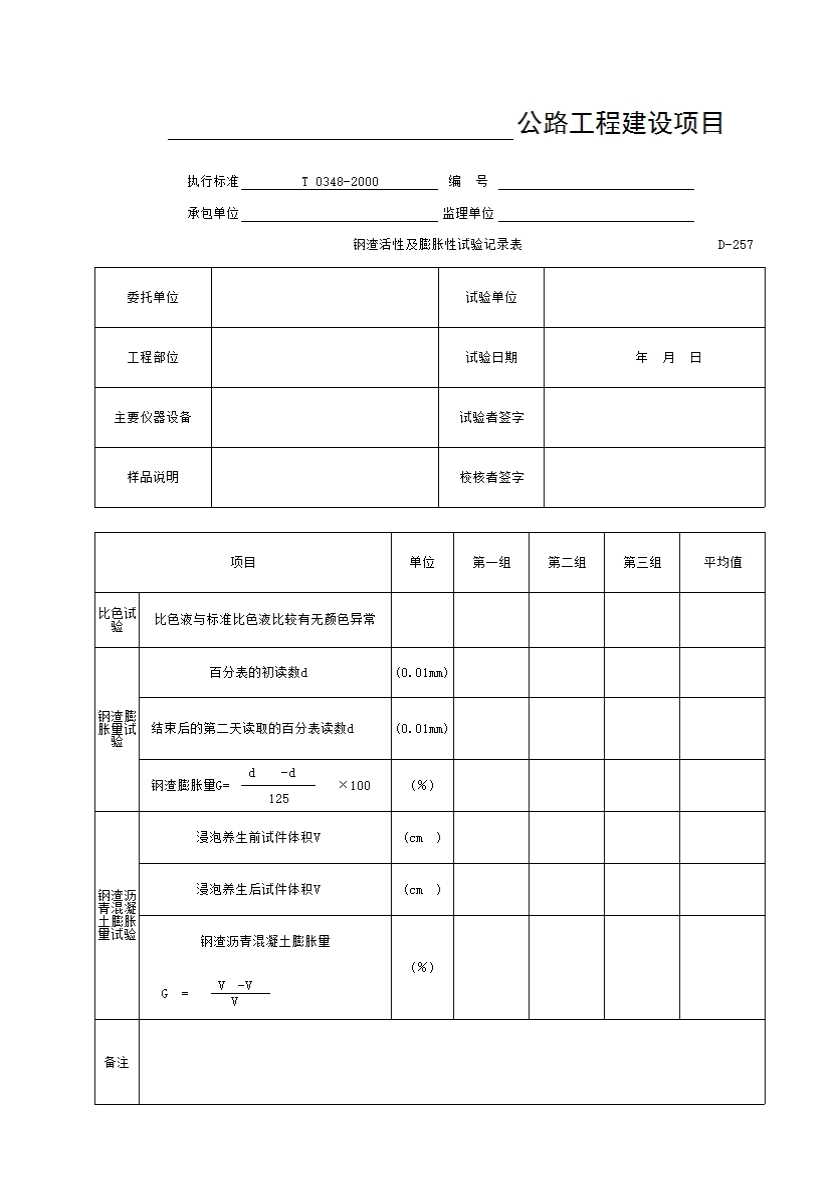 表格名称:D-257 钢渣活性及膨胀性试验记录表