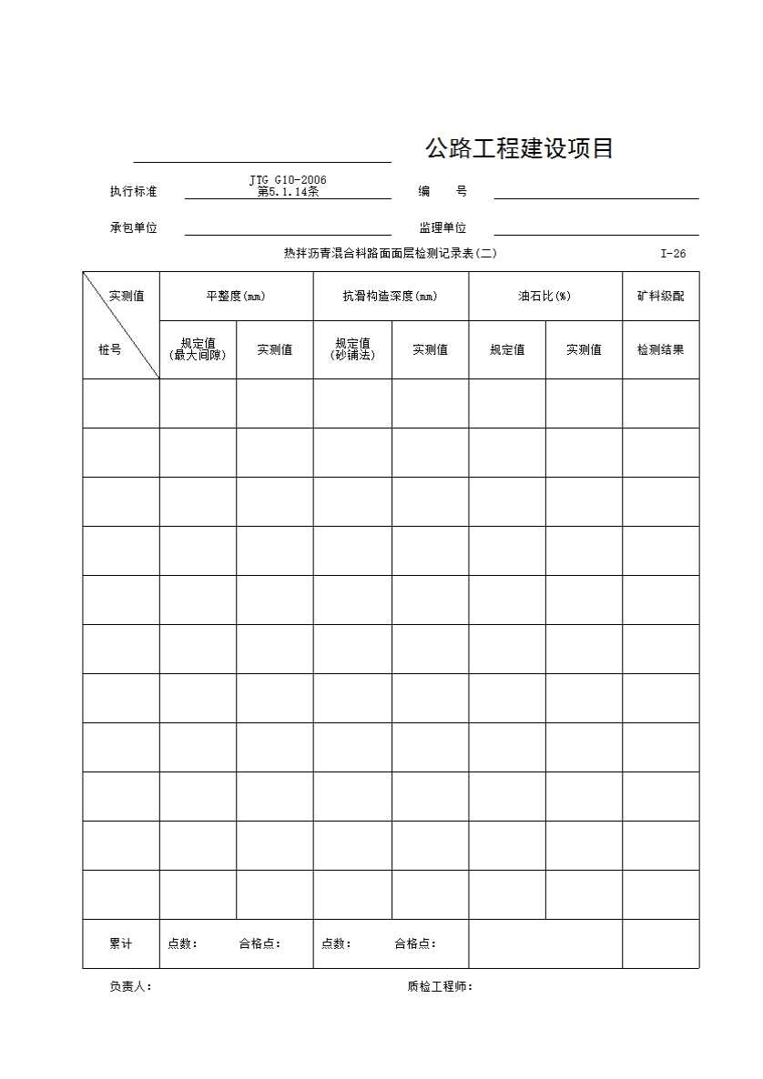 表格名称:I-26表 热拌沥青混合料路面面层检测记录表(二)